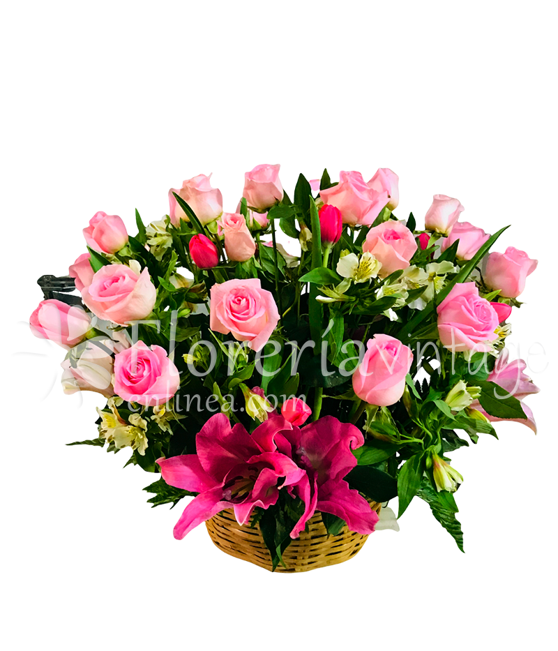 24 ROSAS ROSAS Y 10 TULIPANES EN CANASTA REDONDA